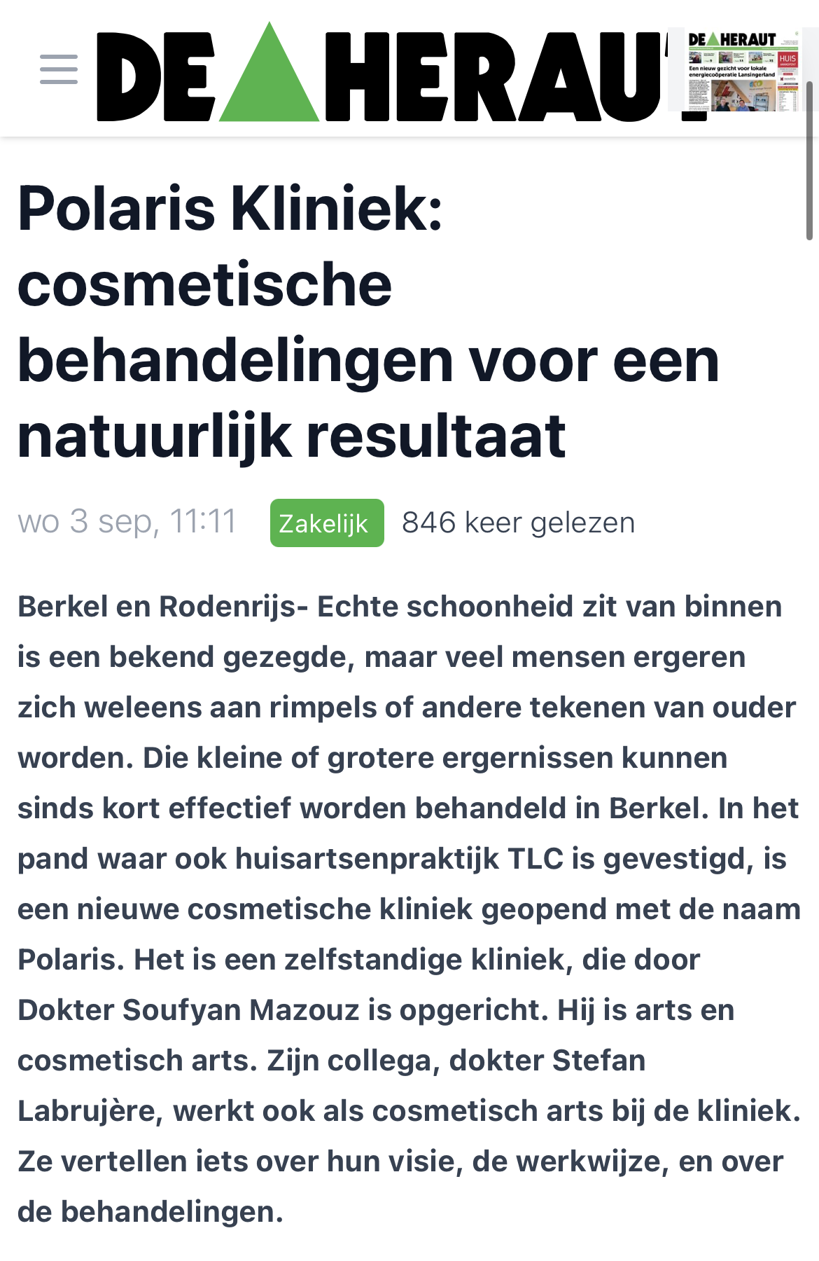 Wij zijn trots dat Polaris Kliniek onlangs in de lokale krant De Heraut heeft gestaan. In het artikel wordt verteld over onze visie: natuurlijke resultaten, persoonlijke benadering en veilige cosmetische behandelingen in een medische omgeving.